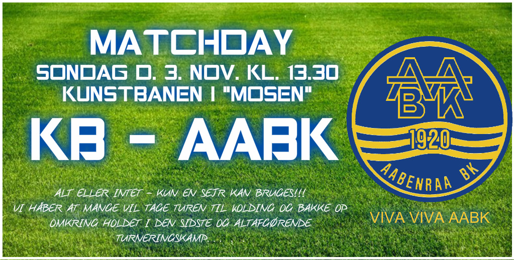 En ting er de andre kampe noget helt andet og altafgørende er at AABK selv formår at gøre arbejdet færdigt søndag eftermiddag i Kolding. Absolut ikke den nemmeste modstander for KB er et mandskab er altid udgøres at gode boldspillere og folk der arbejder stenhårdt for hinanden og klubben. Dette så man senest i sidste weekend, hvor KB og KIF tørnede sammen i kampen om Kolding. Her stillede KIF op med intet mindre end syv spillere fra deres 1. divisionstrup og trykkede KB helt tilbage på banen. Men her viste KB netop karakter og vilje og fightede en 0-0 kamp hjem i et opgør hvor KIF var voldsomt dominerende. Det er netop disse dyder der gør KB farlige for enhver modstander. Så der venter med garanti AABK en meget svær og intens kamp på Kunstbanen i ”mosen” i Kolding.